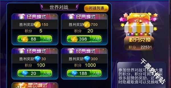 3、积分,在对战的过程中玩家获得的可以累积的对战积分累积到一定数量后,在世界对战界面右侧点击积分兑换则可以看到更多惊喜,不仅有好歌可以兑换体验,更可以通过使用消耗积分来抽奖,获得限时的好歌、超可爱的角色和道具。在积分兑换的界面点击我要积分按钮之后也可以至今使用钻石购买积分。