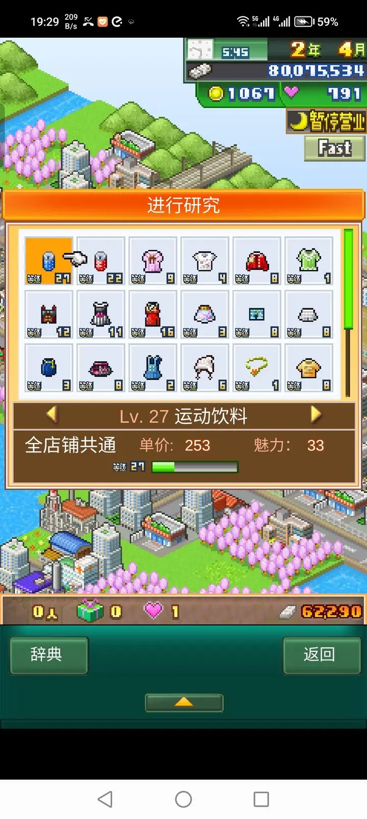 想要东西多,就需要升级原有的事物。以服装店为例,我把长裙升级到Lv15后就多了一些没研究过的衣服。可以先盯着店里数值最高的衣服升级,到后边开出数值更漂亮的衣服后再去升别的。除此之外宣传里的顾客会送研究辞典,按着研究辞典升级也是个好方法。