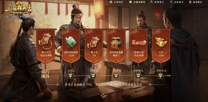 全平台预约突破50 万已解锁三重礼:武将技能经验1500、聚义令10、兵书自选宝箱(精良)1。小程序预约额外得聚义令5 + 公测限定典藏头像框,后续还将解锁限定称号与海量元宝,奖励于公测首月自动发放。