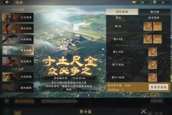 寸土必争:势力值排名最高得50 抽 + 限定称号;